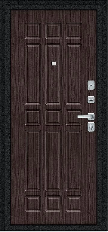 Надежная входная Дверь Браво Мило МФ/BChrome Букле черное/Букле черное/Wenge Melinga премиум класса по цене 34 700 руб. Большая толщина стали защитит от проникновения в ваш дом, квартиру или коттедж. Используется очень качественная фурнитура: замки, цилиндры, ручки, защелки. Покрытие и отделка двери изготовлено под внимательным контролем производителя. Дверь имеет долгий срок службы и гарантию.